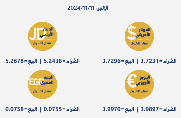 جاءت أسعار صرف العملات مقابل الشيقل الإسرائيلي، اليوم الإثنين، بحسب سلطة النقد الفلسطينية، على النحو التالي:
