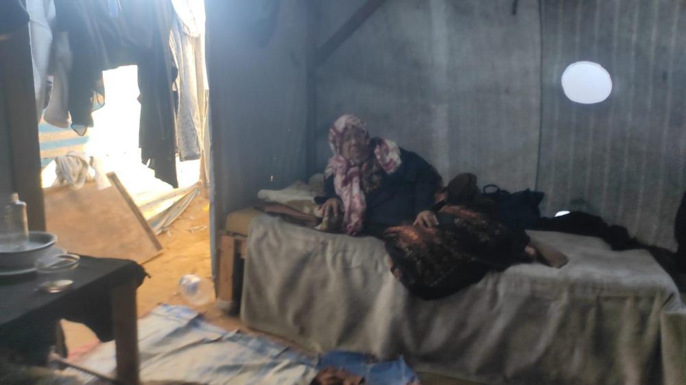 ولا تستطيع الحاجة فاطمة السير على أقدمها، لتستخدم أدوات مساعدة للتحرك ولو لأمتار قليلة في طريقها لقضاء حاجتها أو الجلوس على باب الخيمة على الأقل، كما تشتكي من قلة الغذاء والدواء خاصة للأمراض المزمنة.