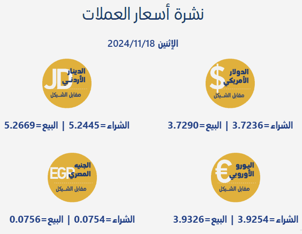 جاءت أسعار صرف العملات مقابل الشيقل الإسرائيلي، اليوم الاثنين، بحسب سلطة النقد الفلسطينية، على النحو التالي: