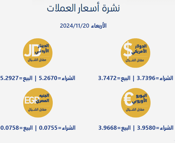 جاءت أسعار صرف العملات مقابل الشيقل الإسرائيلي، اليوم الأربعاء، بحسب سلطة النقد الفلسطينية، على النحو التالي: