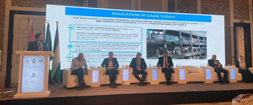 وخلال المؤتمر قدم وكيل "التربية والتعليم" د. نافع عساف ورقة حول الواقع التعليمي لأطفال فلسطين؛ خاصة في ظل استهداف عناصر المنظومة التعليمية في غزة والضفة بما فيها القدس، موضحا أن ما تعرض له قطاع التعليم هو إبادة، منوهاً إلى أن الخسائر لم تقتصر على استهداف الأبنية المدرسية والطلبة والكوادر التعليمية بل شملت الفاقد التعليمي وآثاراً نفسية لا تعبر عنها الإحصائيات.