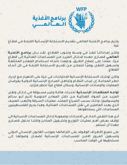 وأضاف: "إن غياب النظام وتجاهل المبادئ الإنسانية الدولية يعرضان العمليات والإمدادات الإنسانية، وسكان قطاع غزة لخطر متزايد. تواجه المنظمات الإنسانية تحديات هائلة وغير مسبوقة في إدخال ونقل المزيد من المواد الغذائية من خلال المعابر الجنوبية (كرم أبو سالم وكيسوفيم)، وذلك بسبب الصراع الممتد.