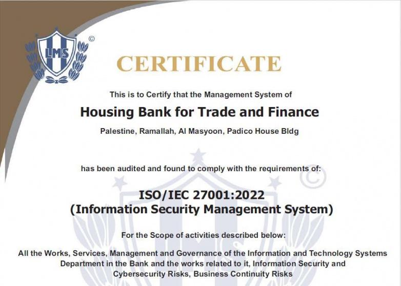 بنك الإسكان في فلسطين يحصل على شهادة المواصفات الدولية ISO27001 للتكنولوجيا وامن المعلومات