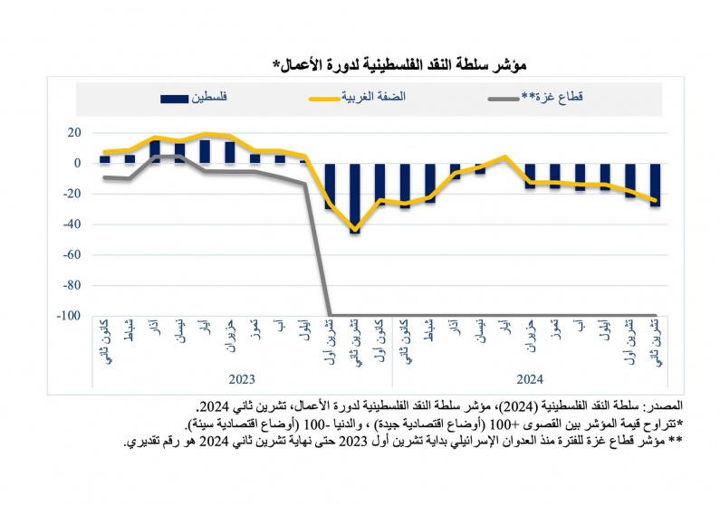 أظهرت نتائج "مؤشر سلطة النقد الفلسطينية لدورة الأعمال" تراجعا كبيرا في المؤشر الكلي في فلسطين، منخفضا إلى -28.4 نقطة خلال تشرين الثاني 2024، مقارنة مع -22.5 نقطة خلال تشرين الأول 2024.