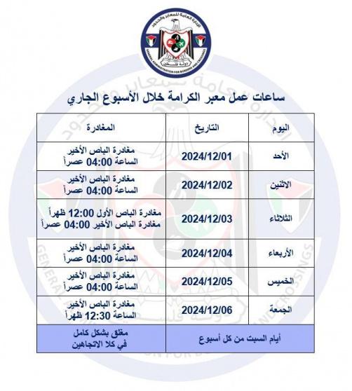 أعلنت الإدارة العامة للمعابر والحدود، اليوم الأحد، ساعات عمل معبر الكرامة (جسر الملك حسين) خلال الأسبوع الجاري.
