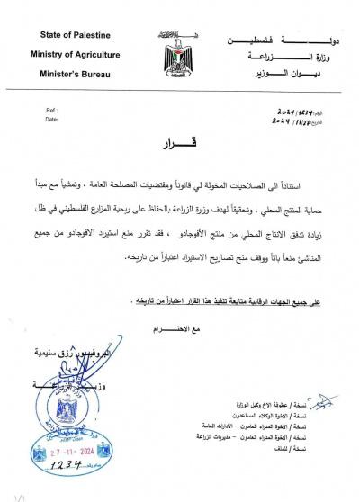 أصدر وزير الزراعة الفلسطيني البروفيسور رزق سليمية اليوم السبت، قرارا بمنع استيراد الأفوجادو منعا باتا ووقف منح تصاريح الاستيراد.