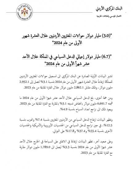 أصدر البنك المركزي الأدرني بيانا حول نسبة حوالات المغتربين الأردنيين للمملكة خلال الـ10 شهور الأولى من 2024، إضافة لقيمة الدخل السياحي خلال الـ11 شهرا الماضية من ذات العام.