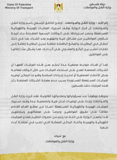 وفي بيان رسمي صدر عن الوزارة قالت إن قرارها بوقف استيراد المركبات الهجينة والكهربائية المستعملة وحصر استيرادها على الوكالات الرسمية المتعددة جاء نتيجة شكاوى المواطنين من مشاكل فنية واجهتهم بعد الشراء، بما في ذلك أعطال في البطاريات والمبالغ الباهظة لتكلفة تبديل البطارية إضافة إلى خلافات تنشب بين البائع والمشتري على أثر ذلك، مما يشكل عبئًا إضافيا على المواطنين.