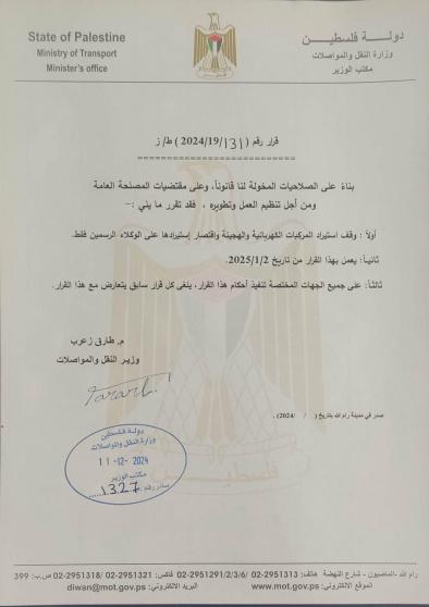 وقال قرش لـ"رايــة" إن ذلك جاء بعد لقاء بين نقابة مستوردي السيارات المستعملة ووزير النقل والمواصلات طارق زعرب، طالبوا بالاستمرار في العمل والاستيراد، الأمر الذي لم يرفضه الوزير، إذ أن الوزارة تريد أمن وسلامة المواطن والسيارة.