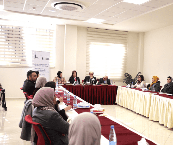 جاء ذلك خلال مشاركة الوزيرة الخليلي في تدريب "شبكة المرأة والمياه الفلسطينية" الذي أطلقته المدرسة الوطنية الفلسطينية للإدارة بحضور رئيس مجلس إدارة المدرسة الوزير موسى أبو زيد، ومساعد وزير الخارجية لشؤون الأمم المتحدة، عمر عوض الله، وبالتعاون مع مؤسسة الهيدرولوجيين، بهدف تمكين المشاركات في التدريب من فهم أسس الدبلوماسية والتفاوض، بالإضافة إلى تعزيز معرفتهن بمبادئ دبلوماسية المياه وإدارة المياه العابرة للحدود.