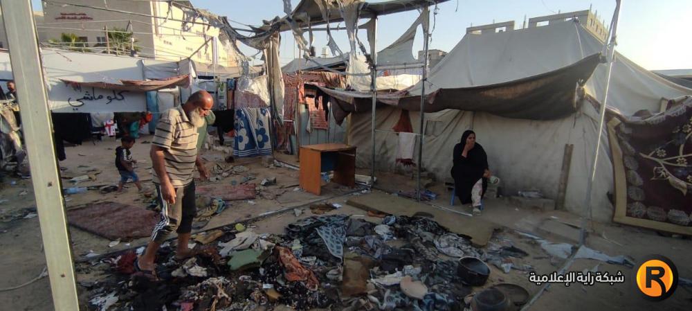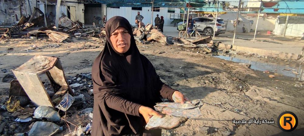 "رايــة" قابلت العم أبو محمد وزوجته، على أنقاض الخيمة المحروقة، حيث تجمع عدد من الجيران النازحين حولهما وهما يلتقطان بقايا العفش المُحترق، علها تشكل حجر الأساس لإعادة الحياة للمكان.