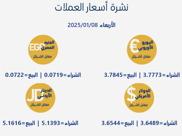 جاءت أسعار صرف العملات مقابل الشيقل الإسرائيلي، اليوم الأربعاء، بحسب سلطة النقد الفلسطينية، على النحو التالي: