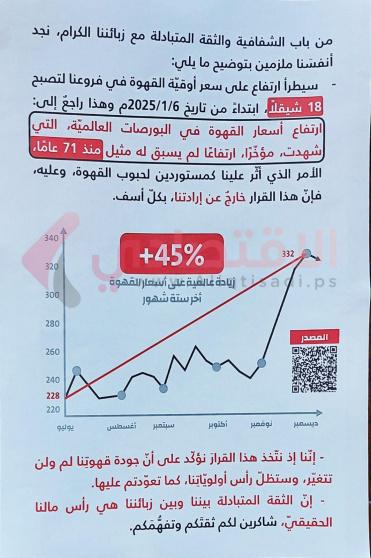 وورد في إعلان معلق داخل أحد محلات الشركة في رام الله، أن الزيادة سببها الارتفاع غير المسبوق في أسعار القهوة عالمياً منذ 71 عاماً.