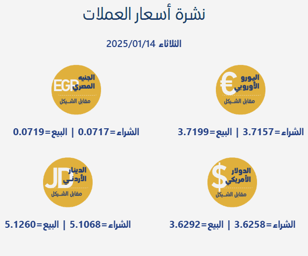 جاءت أسعار صرف العملات مقابل الشيقل الإسرائيلي، اليوم الثلاثاء، بحسب سلطة النقد الفلسطينية، على النحو التالي: