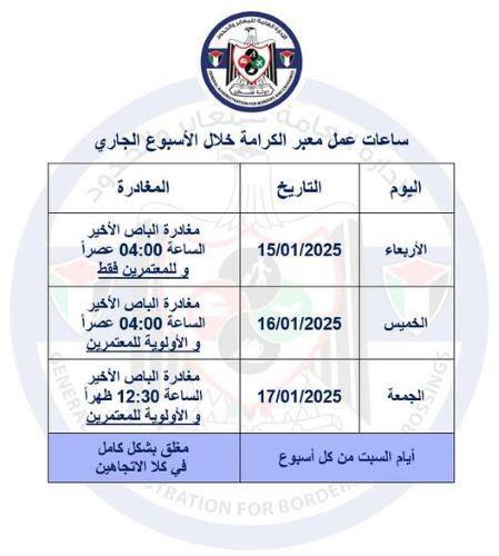 أعلنت الإدارة العامة للمعابر والحدود، مساء اليوم الثلاثاء، ساعات عمل معبر الكرامة، خلال الأيام الثلاثة المقبلة، على النحو التالي: