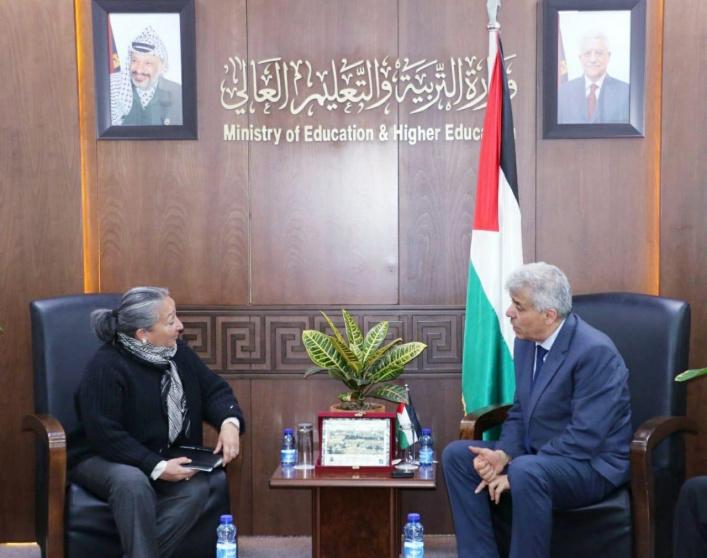 بحث وزير التربية والتعليم العالي أ.د أمجد برهم مع ممثلة اليونيسيف في فلسطين جين غوف سبل إغاثة وإسناد التعليم في قطاع غزة، ودراسة آفاق العمل في المرحلة المقبلة خاصة مع وقف عدوان الاحتلال على القطاع.
