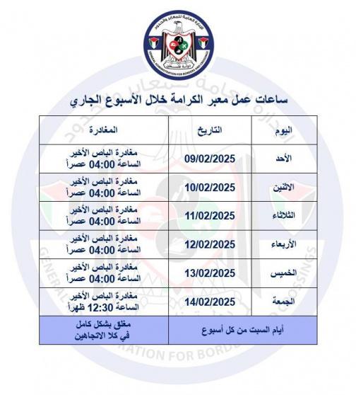 أعلنت الإدارة العامة للمعابر والحدود، اليوم الأحد، ساعات عمل معبر الكرامة (جسر الملك حسين) خلال الأسبوع الجاري.