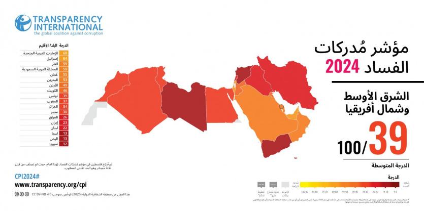 أصدرت منظمة الشفافية الدولية نتائج مؤشر مدركات الفساد (CPI) للعام 2024 لدول العالم، والمتضمن لنتائج الدول العربية، إذ أظهرت نتائج المؤشر أن الفساد لا يزال متجذراً بعمق في العالم، وفي منطقة الشرق الأوسط وشمال أفريقيا، حيث لم تشهد المنطقة تقدمًا يُذكر خلال السنوات الـ 12 الماضية، بالرغم من ارتفاع متوسط درجات المنطقة بنقطة واحدة فقط عن العام الماضي، من 38 إلى 39 من 100، إلا أنه يبقى أقل بكثير من المتوسط العالمي البالغ 43%.