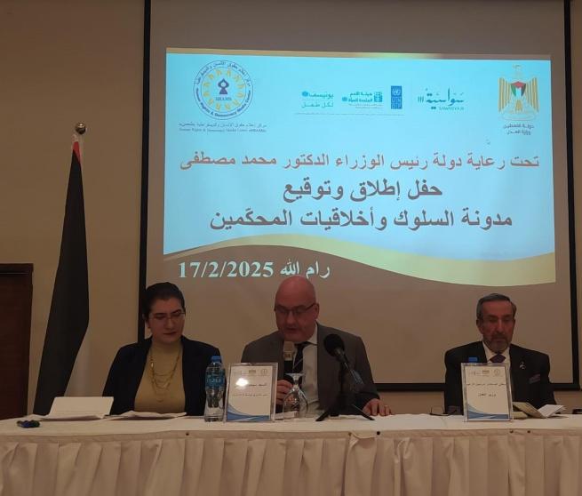 نظمت وزارة العدل ومركز إعلام حقوق الإنسان والديمقراطية "شمس" بالتعاون مع وبالشراكة مع برنامج سواسية 3 المشترك، حفل إطلاق وتوقيع مدونة سلوك وأخلاقيات المحكّمين، يأتي إصدار هذه المدونة استناداً إلى قانون التحكيم رقم (3) لسنة 2000 ولائحته التنفيذية رقم (39) لسنة 2004، وذلك لتعزيز الإطار القانوني للتحكيم في فلسطين، وتوفير معايير واضحة تحكم أخلاقيات العملية التحكيمية، كما يشكل خطوة مهمة نحو تطوير منظومة التحكيم والوسائل البديلة لحل النزاعات في فلسطين، وتعزيز الثقة بها كأداة عادلة وفعالة لتحقيق العدالة الناجزة، فضلاً عن ترسيخ مبادئ النزاهة والشفافية والاستقلالية في عمل المحكمين.