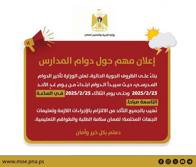 أعلنت وزارة التربية والتعليم، اليوم السبت، عن تأخير الدوام المدرسي اعتبارا من يوم غد الاحد 23/2/2025، وحتى يوم الثلاثاء 25/2/2025، إلى الساعة التاسعة صباحا، بسبب الأحوال الجوية السائدة.