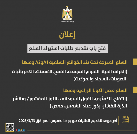 لمزيد من التفاصيل حول الإجراءات للسلع والكميات وارقام التعرفة وللحصول على النماذج يمكن مراجعة موقع وزارة الاقتصاد الوطني WWW.MNE.GOV.PS تحت عنوان كوتا 2025