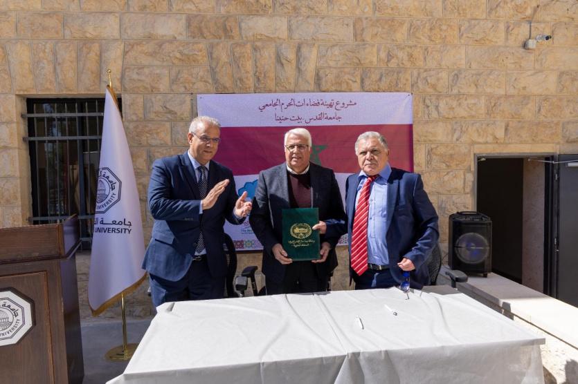 تم اليوم الخميس في القدس تنظيم حفل تدشين مشروع تهيئة فضاءات الحرم الجامعي، لجامعة القدس – بيت حنينا بكلفة مالية بلغت زهاء 395 ألف دولار أمريكي، بتمويل من المملكة المغربية، بحضور الدكتور محمد سالم الشرقاوي، المدير المكلف بتسيير وكالة بيت مال القدس الشريف، والدكتور عماد الخطيب النائب التنفيذي لرئيس الجامعة.