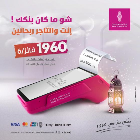 تستمر الحملة طيلة أيام الشهر الفضيل وتنتهي بتاريخ 30/3/2025، وستتيح للعملاء الفوز ب 1960 جائزة تساوي قيمة مشتريات العميل، بحد أقصى 300 شيكل وأدنى 50 شيكل. علماً بأن إعلان الفائزين بالجوائز سيكون بشكل يومي عبر الموقع الإلكتروني الخاص بالبنك ومواقع التواصل الاجتماعي التابعة للبنك.