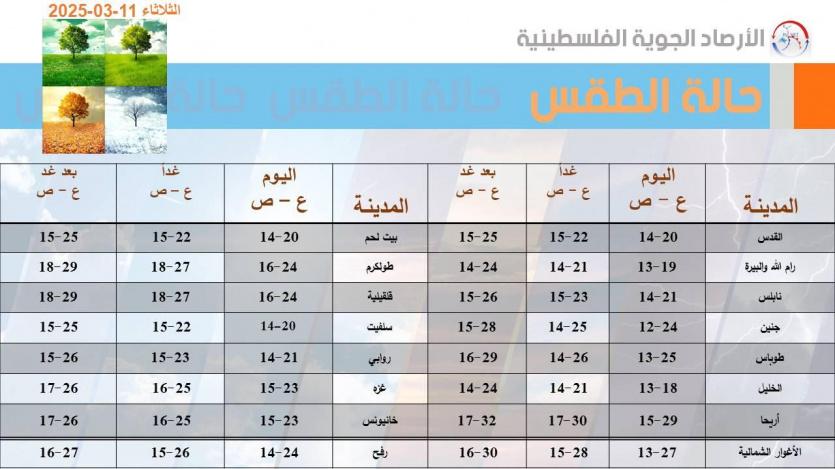 ويوم غد الأربعاء، يكون الجو صافياً بوجه عام ربيعيا لطيفا ومعتدلا في المناطق الجبلية حارا نسبيا في بقية المناطق ويطرأ ارتفاع اخر على درجات الحرارة لتصبح أعلى من معدلها العام بحدود 4 درجات مئوبة ، الرياح شمالية شرقية الى جنوبية شرقية خفيفة الى معتدلة السرعة،تنشط أحيانًا والبحر خفيف ارتفاع الموج.