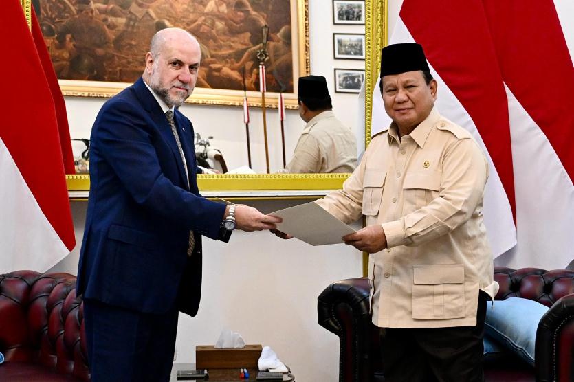 سلم قاضي قضاة فلسطين، مستشار الرئيس للشؤون الدينية والعلاقات الإسلامية محمود الهباش، رسالة خطية من الرئيس محمود عباس رئيس دولة فلسطين إلى رئيس جمهورية إندونيسيا فرابوو سوبيانتو تتعلق بالوضع في فلسطين والعلاقات الثنائية بين البلدين.