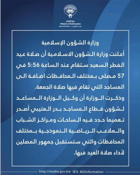 ختامًا، تدعو وزارة الشؤون الإسلامية جميع المواطنين والمقيمين في الكويت إلى الالتزام بالمواعيد المحددة لصلاة عيد الفطر، والحرص على أداء الصلاة في الأماكن المخصصة لذلك لضمان سهولة الحركة والتنظيم. كل عام وأنتم بخير!