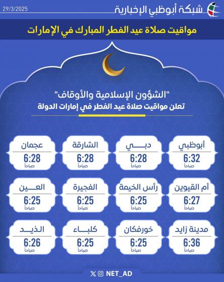 موعد مواقيت صلاة عيد الفطر في الإمارات 2025 أبو ظبي دبي وكل المدن