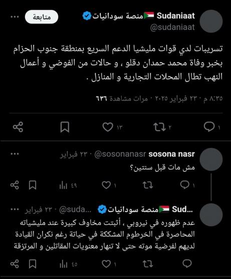 بعد ما سبق وعقب متابعة المنصات الرسمية للدعم السريع ووسائل الإعلام الموثوقة تبين أن خبر وفاة محمد حمدان دقلو حميدتي المتداول على مواقع التواصل الاجتماعي غير صحيح حتى الان.