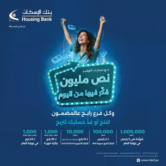 انطلاقا من سياسة البنك الهادفة لتعزيز ثقافة الادخار لدى عملائه ومكافأتهم على ولائهم وثقتهم، أطلق بنك الإسكان حملته الترويجية الخاصة بحسابات التوفير للعام 2025 تحت شعار "نص مليون فكر فيها من اليوم" وتبلغ قيمة الجائزة الكبرى مليون شيقل تقدم في نهاية العام لرابحين اثنين، وذلك سعيا من البنك لتشجيع المواطن الفلسطيني بشكل عام وعملاء البنك بشكل خاص على التوفير والادخار، ومن جانب آخر منح المدخرين لدى البنك من كافة القطاعات وجميع الأعمار فرصاً كبيرة للفوز بجوائز عديدة وبقيم كبيرة.
