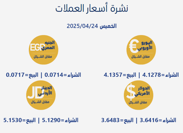 جاءت أسعار صرف العملات مقابل الشيقل الإسرائيلي، اليوم الخميس، بحسب سلطة النقد الفلسطينية، على النحو التالي: