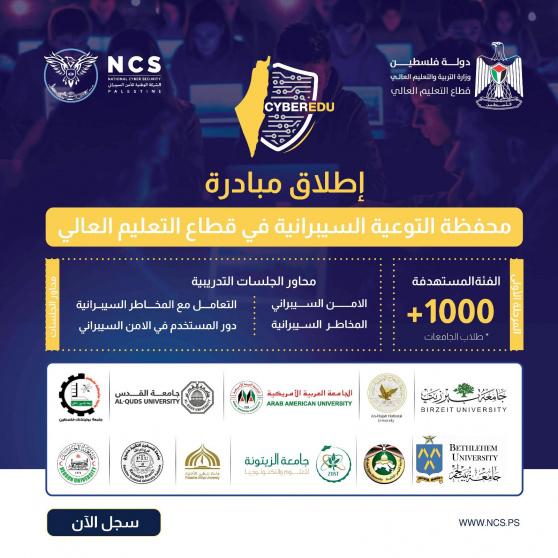 في خطوة هامة لتعزيز الوعي بالأمن السيبراني بين طلاب الجامعات الفلسطينية، أعلنت الشركة الوطنية للأمن السيبراني وفي اطار رؤيتها معاً نحو فضائي سيبراني فلسطيني آمن ، عن إطلاق مبادرة "CyberEDU"بالتعاون مع وزارة التربية والتعليم العالي الفلسطينية.