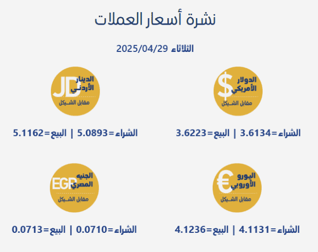 جاءت أسعار صرف العملات مقابل الشيقل الإسرائيلي، اليوم الثلاثاء، بحسب سلطة النقد الفلسطينية، على النحو التالي: