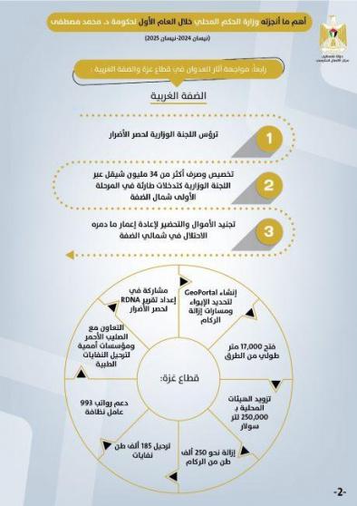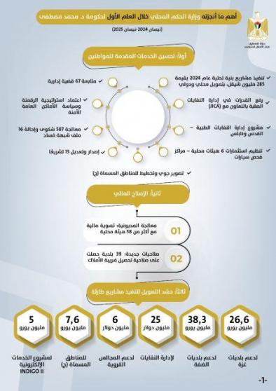 استعرض مركز الاتصال الحكومي في تقرير مبني على بيانات وزارة الحكم المحلي، أهم الإنجازات التي حققتها الوزارة خلال عام من تولي الحكومة مهامها في نيسان 2024 إلى نيسان 2025، وشملت تحسين الخدمات المقدمة للمواطنين، وتعزيز البنية التحتية، والإصلاح المالي، وحشد التمويل لمشاريع طارئة، إضافة إلى مواجهة آثار العدوان الإسرائيلي على قطاع غزة والمحافظات الشمالية.