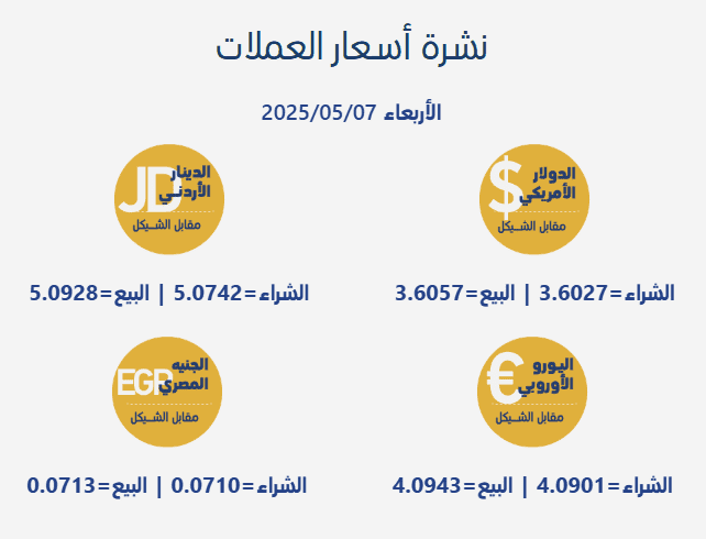 جاءت أسعار صرف العملات مقابل الشيقل الإسرائيلي، اليوم الأربعاء، بحسب سلطة النقد الفلسطينية، على النحو التالي: