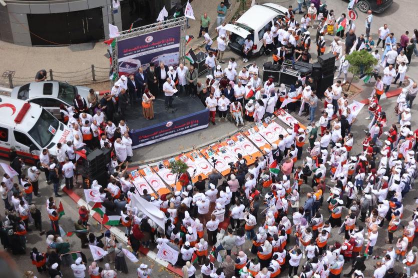 رام الله: الهلال الأحمر ينظم مسيرة تخللها جنازة رمزية لشهداء العمل الإنساني