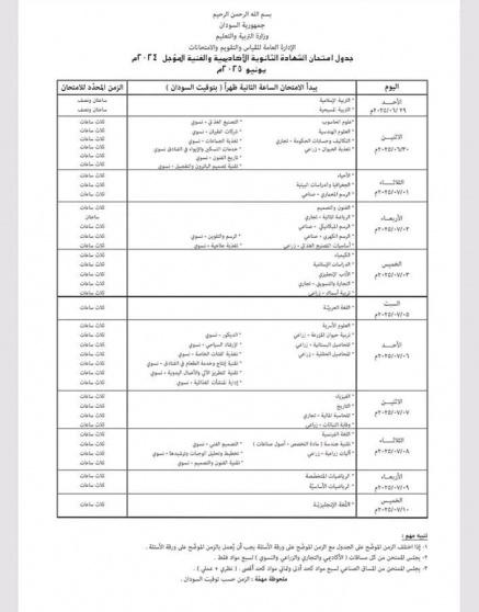 جدول امتحانات الشهادة السودانية دفعة 2024