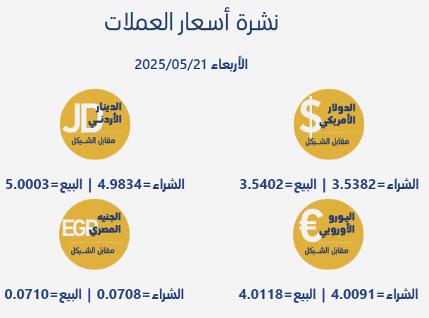 جاءت أسعار صرف العملات مقابل الشيقل الإسرائيلي، اليوم الأربعاء، بحسب سلطة النقد الفلسطينية، على النحو التالي: