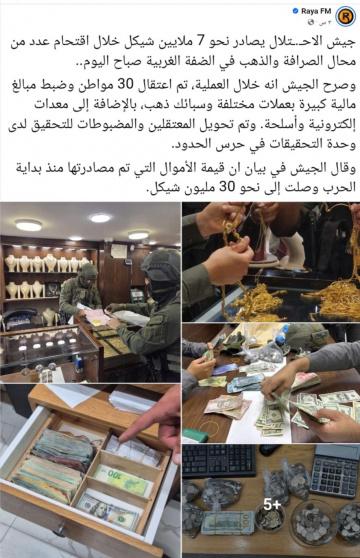نفذت قوات الاحتلال الإسرائيلي، صباح أمس الثلاثاء، مداهمات متزامنة استهدفت محلات الصرافة في عدة مدن بالضفة الغربية، شملت نابلس ورام الله والبيرة وقلقيلية والخليل وجنين وطوباس وطولكرم، حيث قامت بمصادرة أموال وممتلكات تُقدّر بنحو 7 ملايين شيكل، بينها مبالغ نقدية وذهب.