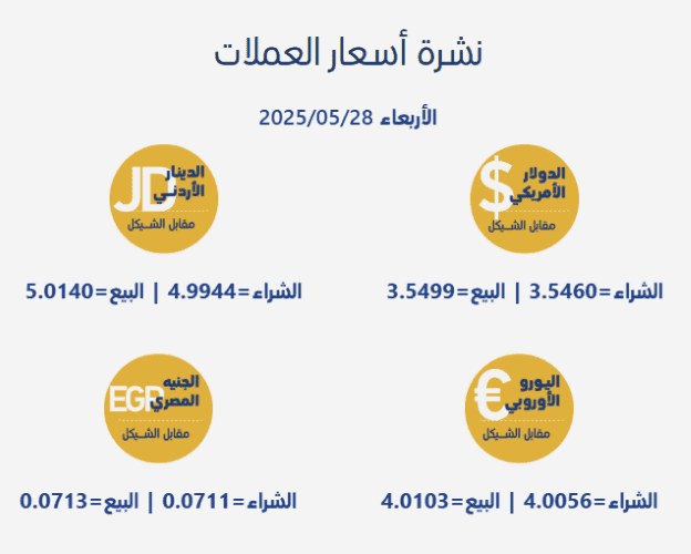 جاءت أسعار صرف العملات مقابل الشيقل الإسرائيلي، اليوم الأربعاء، بحسب سلطة النقد الفلسطينية، على النحو التالي: