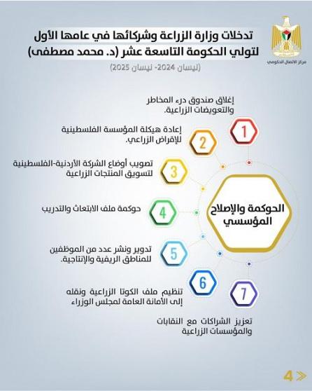 أصدر مركز الاتصال الحكومي تقريرا يسلط الضوء على أهم تدخلات وزارة الزراعة وشركائها، في حصاد العام الأول لتولي حكومة محمد مصطفى، التي مسّت مختلف القطاعات الزراعية، من الثروة الحيوانية والإنتاج النباتي، إلى الموارد الطبيعية والإصلاح المؤسسي، مع اهتمام خاص بالمحافظات الجنوبية، ودفع واضح باتجاه تعزيز الأمن الغذائي والمائي، وتحسين جودة الصادرات الزراعية ودعم صمود المزارعين المتضررين من اعتداءات الاحتلال.