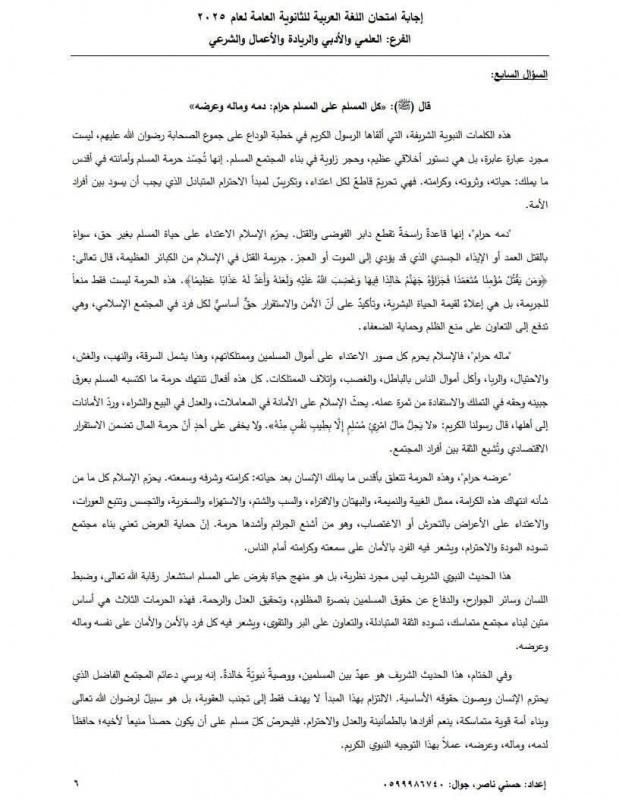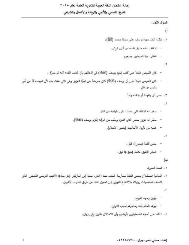إجابات حل امتحان اللغة العربية للثانوية العامة توجيهي فلسطين 2025 إجابة العربي