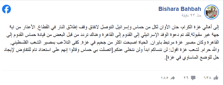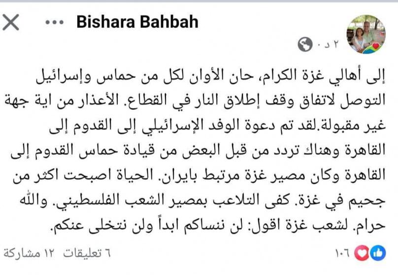 وبعد دقائق على نشره هذا المنشور عبر فيسبوك، تم تعديل منشور "بحبح" عدة مرات، حيث كتب لاحقا: "اتصلت بحماس وقالوا إنهم على استعداد تام للتفاوض لإيجاد حل للوضع المأساوي في غزة". وأخيرا قام بحذف المنشور نهائيا، دون توضيح السبب.