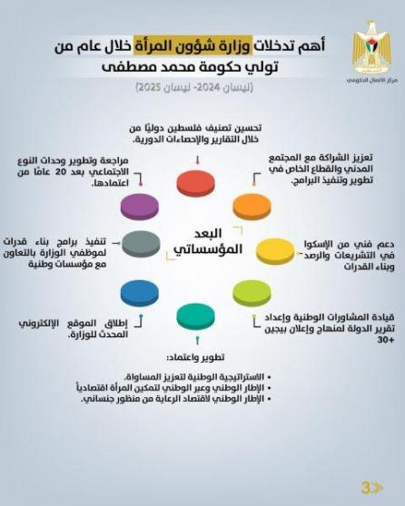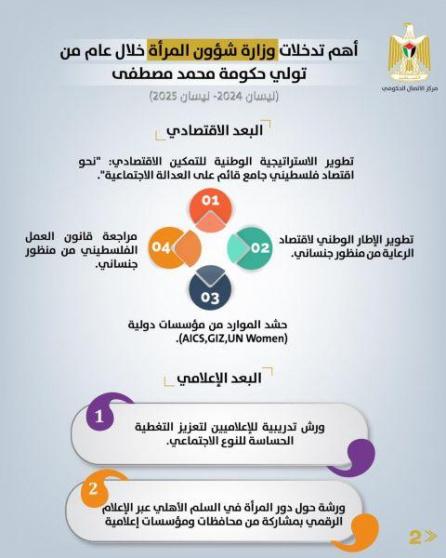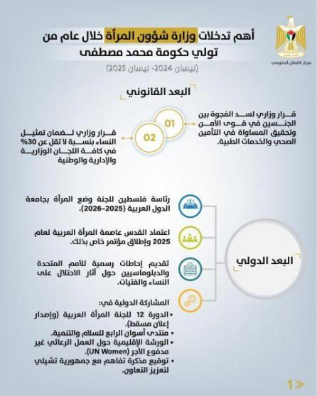 استعرض مركز الاتصال الحكومي، أهم تدخلات وزارة شؤون المرأة خلال العام الأول من تولي حكومة محمد مصطفى، في مجالات متعددة شملت الأبعاد القانونية والاقتصادية والاجتماعية والدولية والمؤسساتية والإعلامية، وذلك ضمن جهود متواصلة لتعزيز المساواة بين الجنسين، وتمكين المرأة الفلسطينية على المستويات كافة.