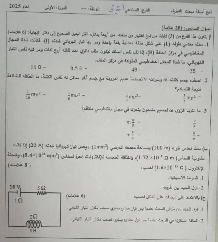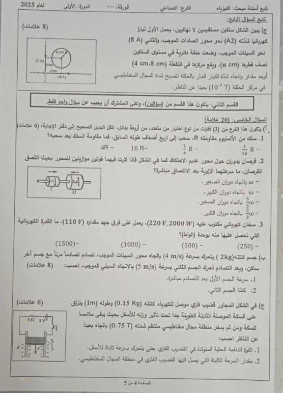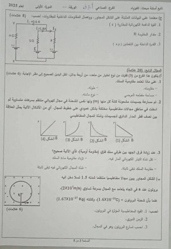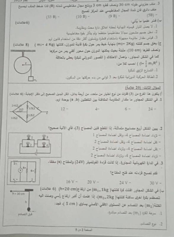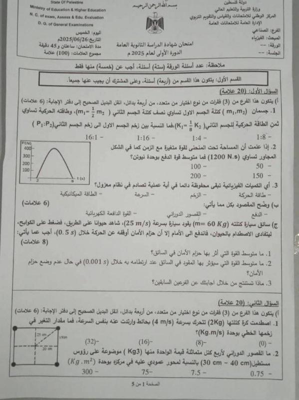 إجابات حل امتحان الفيزياء للثانوية العامة توجيهي فلسطين 2025 إجابة دقيقة