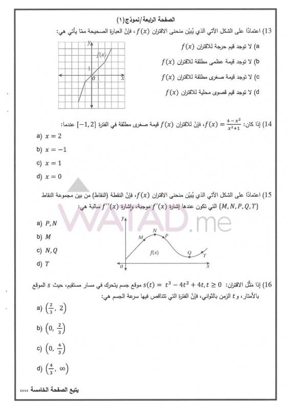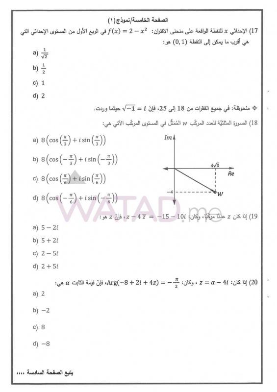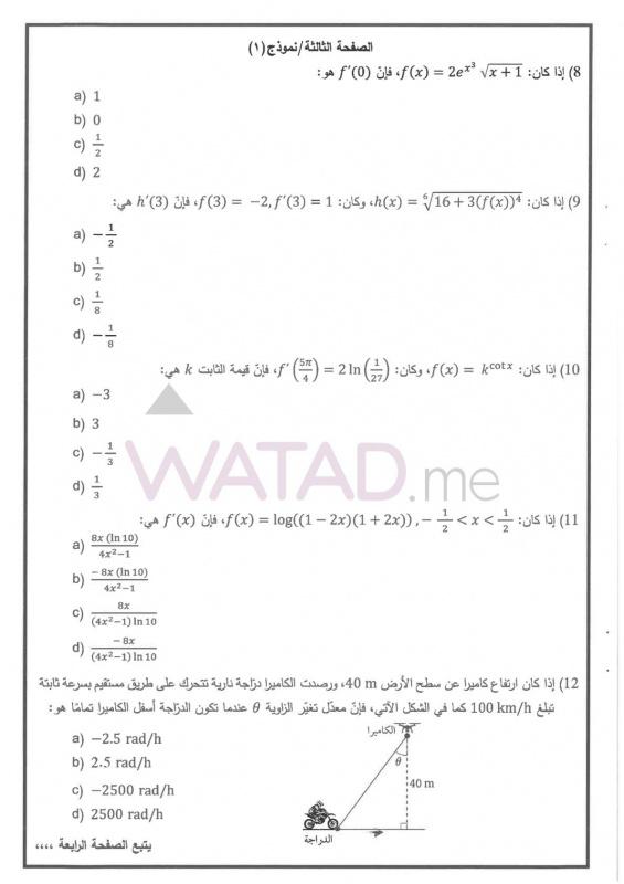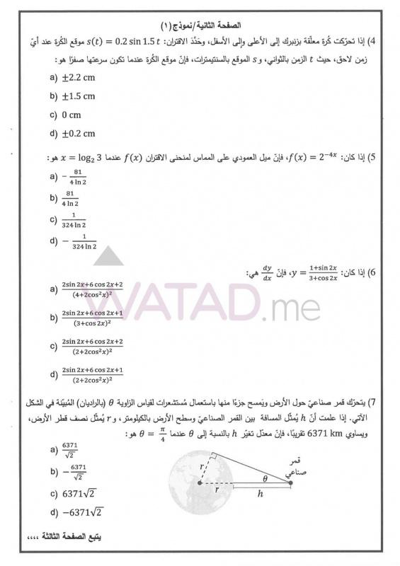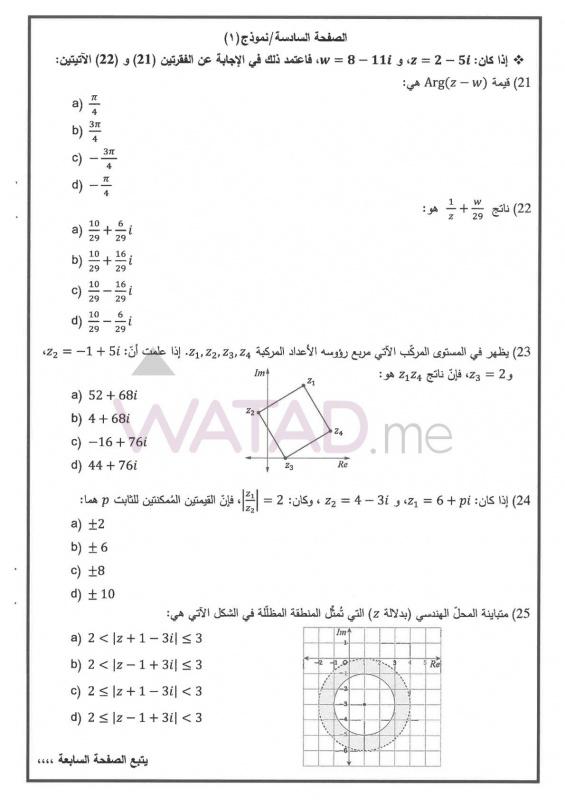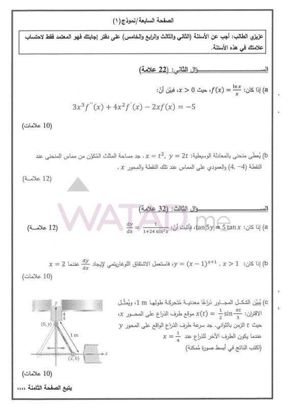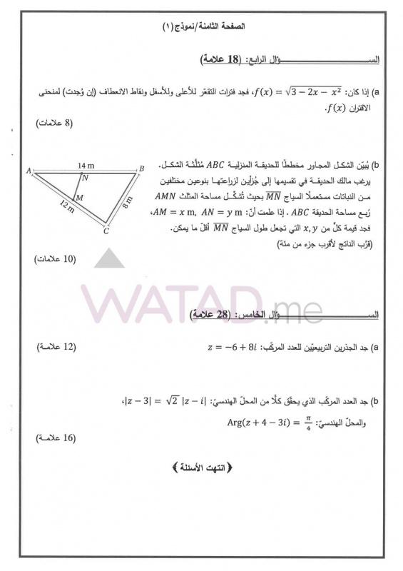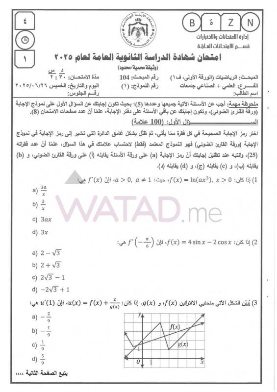 إجابة حل أسئلة امتحان الرياضيات الورقة الأولى 1 للثانوية العامة توجيهي الأردن 2025 الفرع العلمي