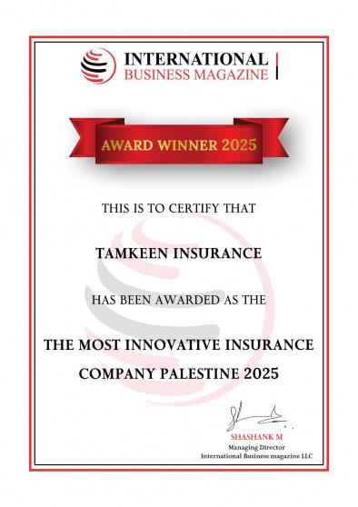 حصلت شركة تمكين الفلسطينية للتأمين على جائزة "شركة التأمين الأكثر ابتكاراً في فلسطين للعام 2025" The Most Innovative Insurance Company Palestine 2025، الصادرة عن مجلة الأعمال الدولية IBM، وهي مجلة دولية مقرها الإمارات العربية المتحدة، تعتمد برامج جوائز سنوية للأداء المتميز للشركات ومؤسسات الأعمال على مستوى العالم وتشمل الولايات المتحدة الأمريكية، أوروبا، الشرق الأوسط، آسياً وإفريقيا، في كافة القطاعات وعلى وجه الخصوص قطاعات: التأمين، الصيرفة والخدمات الصحية. حيث تم ترشيح الشركة من قبل اللجنة التنظيمية عن فئة شركات التأمين العاملة في فلسطين وقارة آسيا ضمن تصنيف الأكثر ابتكاراً، نظراً للابتكار الرقمي التي أعلنت عنه الشركة مؤخراً والمتمثل في اطلاق خدمات التأمين الرقمي التي تتيح اصدار أو تجديد وثائق التأمين رقمياً وتسديد الأقساط عبر قنوات الدفع الإلكترونية من خلال تطبيق الهاتف الخلوي "Tamkeen Mobile" ونافذة المشتركين الإلكترونية عبر الموقع الإلكتروني www.tamkeen-ins.ps . علماً بأن احتفالية تسليم الجوائز ستقام في الإمارات العربية المتحدة في نهاية العام الحالي.